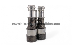 Il corpo del binocolo più grande è formato da due tubi in argento elegantemente cesellati e finemente incisi: su ognuno di essi è riportato il monogramma personale di Re Umberto I di Savoia mentre, su ognuno dei tubi para pioggia estraibili, è presente l'armoriale di Casa Savoia magistralmente eseguito a sbalzo e particolareggiato con i più minuziosi dettagli.