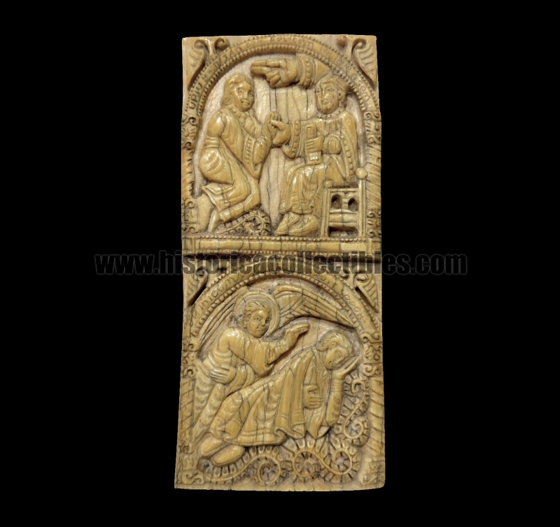 Bone plaque or panel depicting two scenes carved in bas-relief from the life of San Millán de la Cogolla, dated between the late 16th and early 17th centuries.