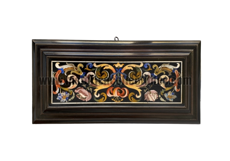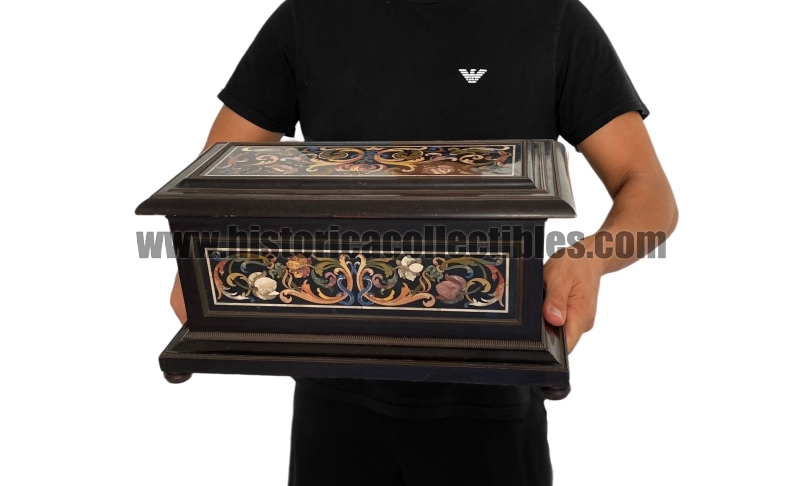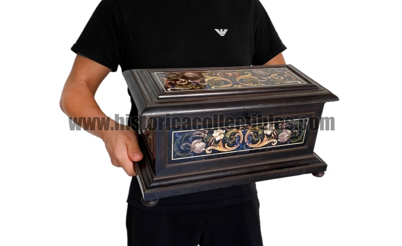 In its rectangular wooden structure, five black marble panels are set and decorated inside refined bronze frames, two front-back, two on the sides and one on the lid under which a geometric decoration composed from threaded light rosewood plates with ebony inlay. The marble panels are admirably inlaid with precious varieties of semi-precious stones elaborated to form various species of flowers including roses, tulips, cornflowers and scrolled acanthus leaves, characteristic of the designs of Giovanni Battista Foggini (Florence 1652-1725), one of the most illustrious Italian architects and sculptors of the Baroque artistic period who, in the service of the de Medici family under the Grand Duke Cosimo III, was from 1685 enthusiastic artistic director of the Gallery of Works of the Opificio delle Pietre Dure (Grand Ducal Workshops) where he supervised every detail of the works produced in them.