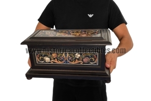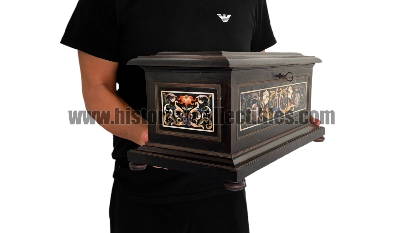 The execution of the marble and semi-precious stone panels present on this casket, having seen and compared the corresponding executive stylistic dictates in other works present in the Museum of the Opificio delle Pietre Dure in Florence, can be traced back to the Maestranza of Antonio Cappelli in 1685.