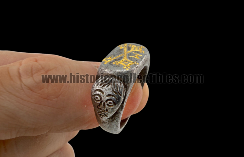 A single-piece forged iron ring, crafted using hot modeling and subsequent burin finishing, dating to the Gothic period (14th century). The meticulous sculptural detail, evident in the two faces carved in high relief on either side of the bezel, suggests it belonged to a high-ranking figure, likely an emissary, official, or representative of the city of Regensburg. The ring has a solid, annular body with a slightly oval cross-section, gradually thickening towards the top.