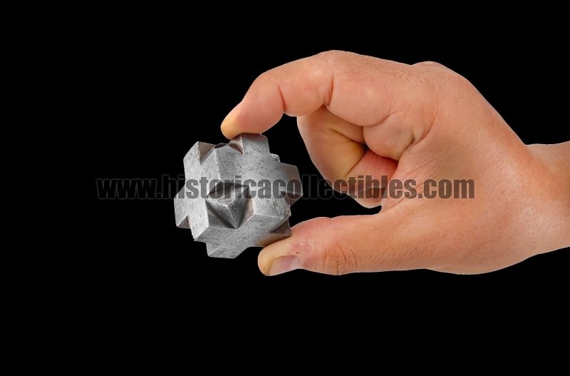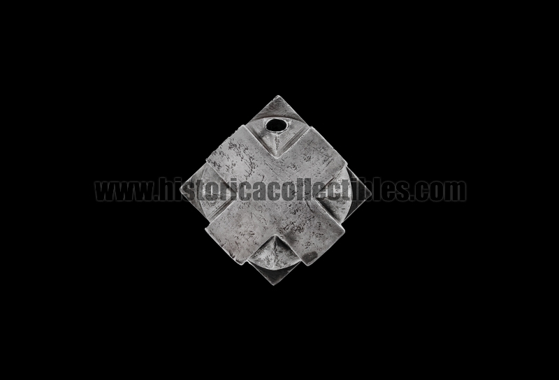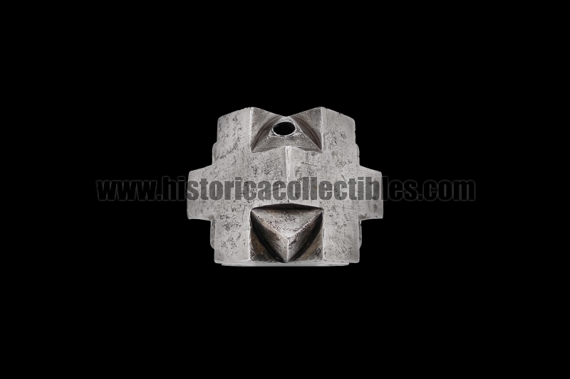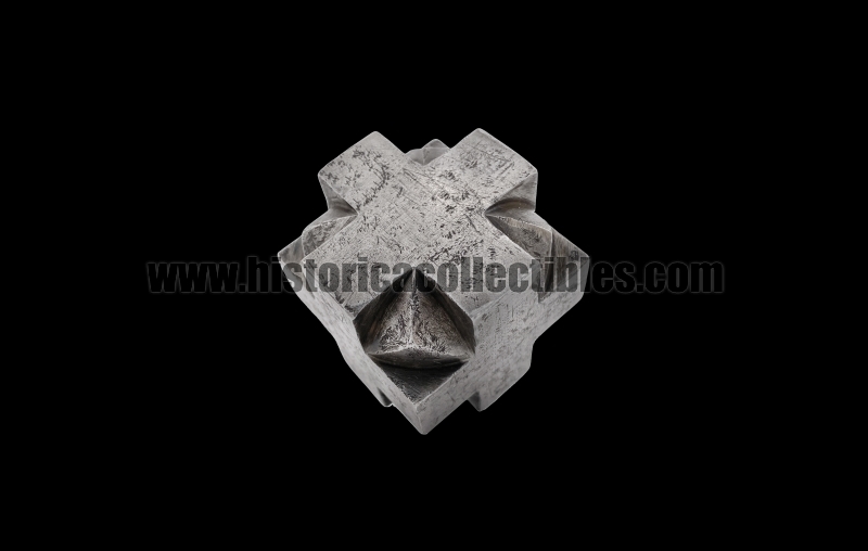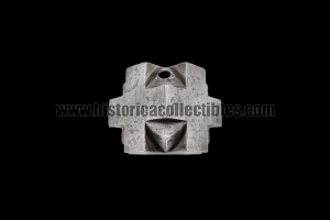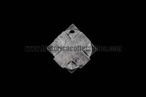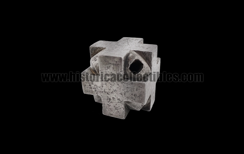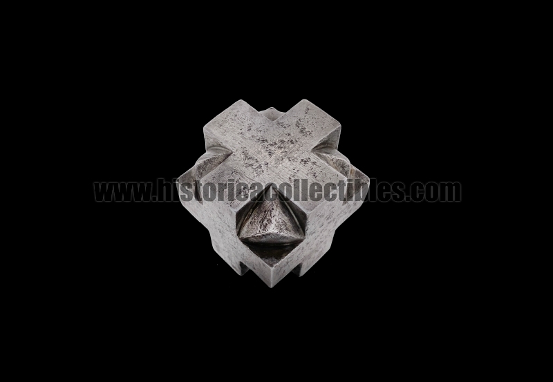 Sturdy pommel-mace for a one-and-a-half sword, also known as a "bastarda," in the shape of a hexahedron cube with quadrilateral cross-shaped faces, which follow one another and are joined by triangles carved within each of their individual arms. This hexahedron cube-shaped pommel, in fact, has been crafted using a special cross-shaped process to create 26 sharp 90° angles, plus another 8 formed by the triangles connecting the crosses. It was therefore likely designed to equip a sword that not only had to be used for cutting, but also, in times of other needs, could be held upside down and used as a mace.