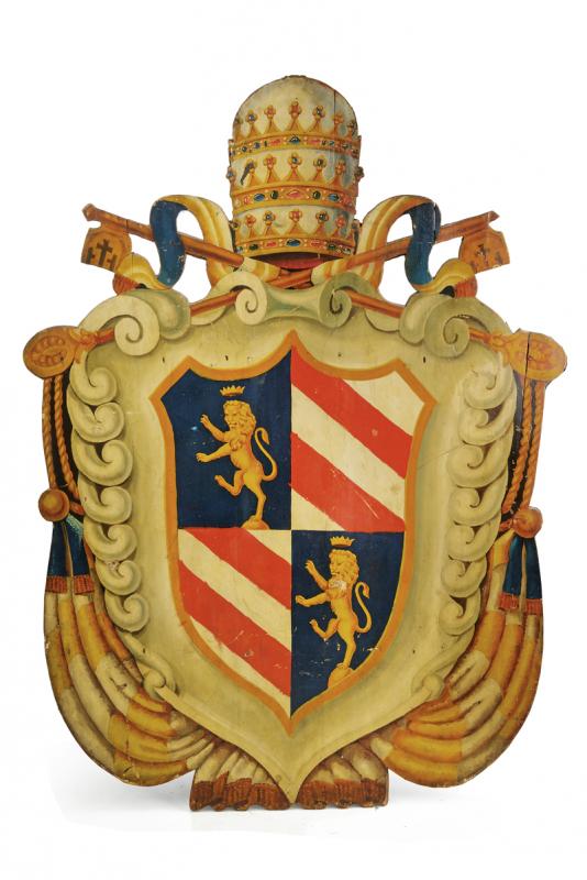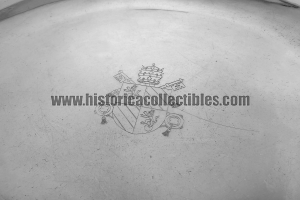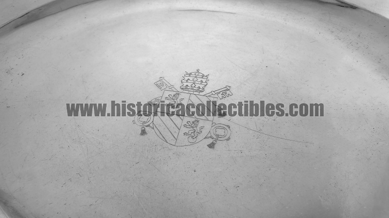 At the center of the paten, meticulously engraved in every detail, is the papal coat of arms of Pope Pius IX, which was in use from June 16, 1846, until his death on February 7, 1878.