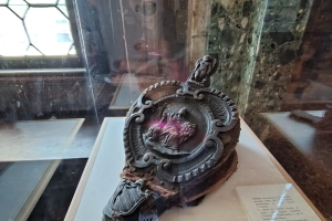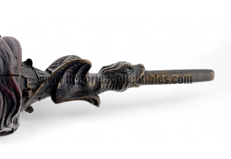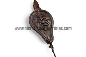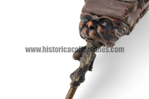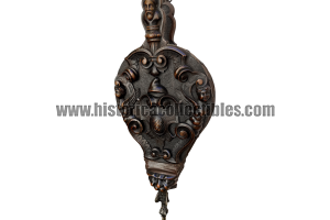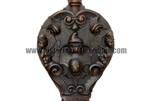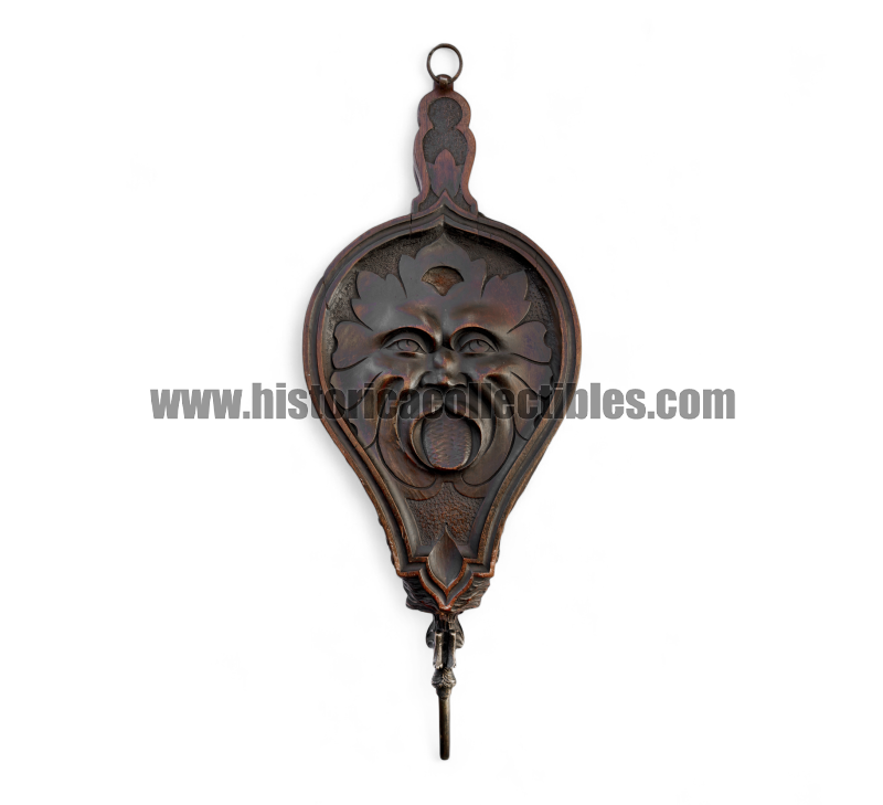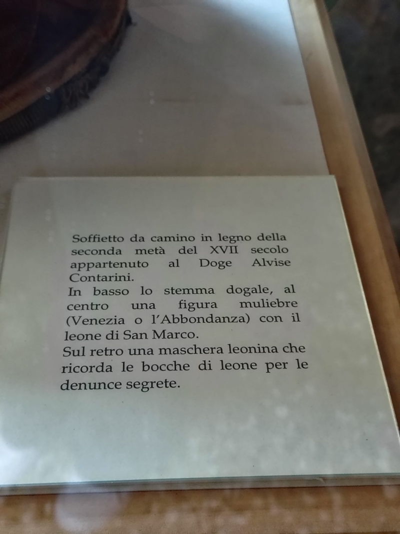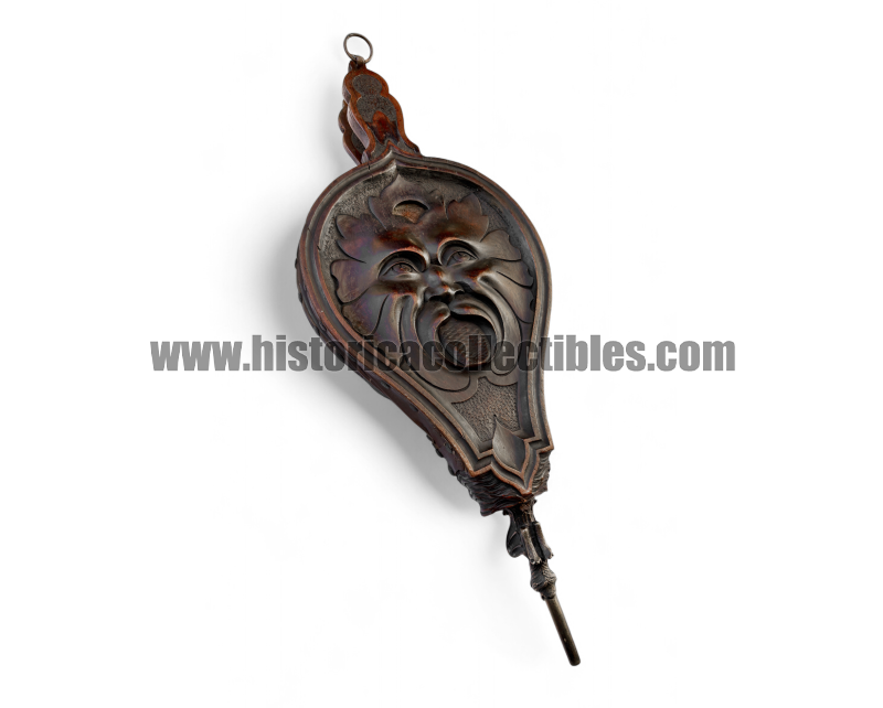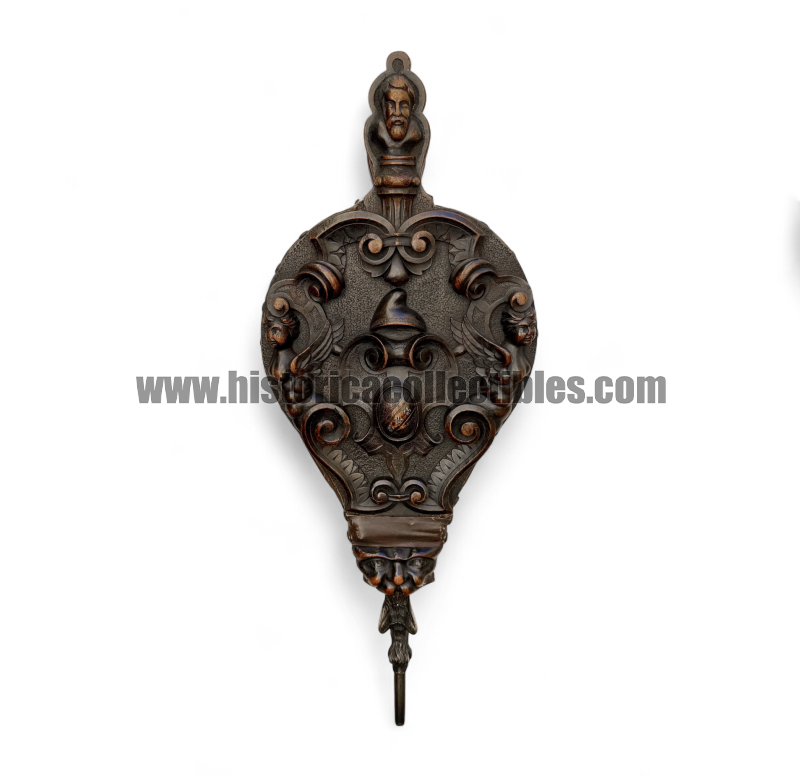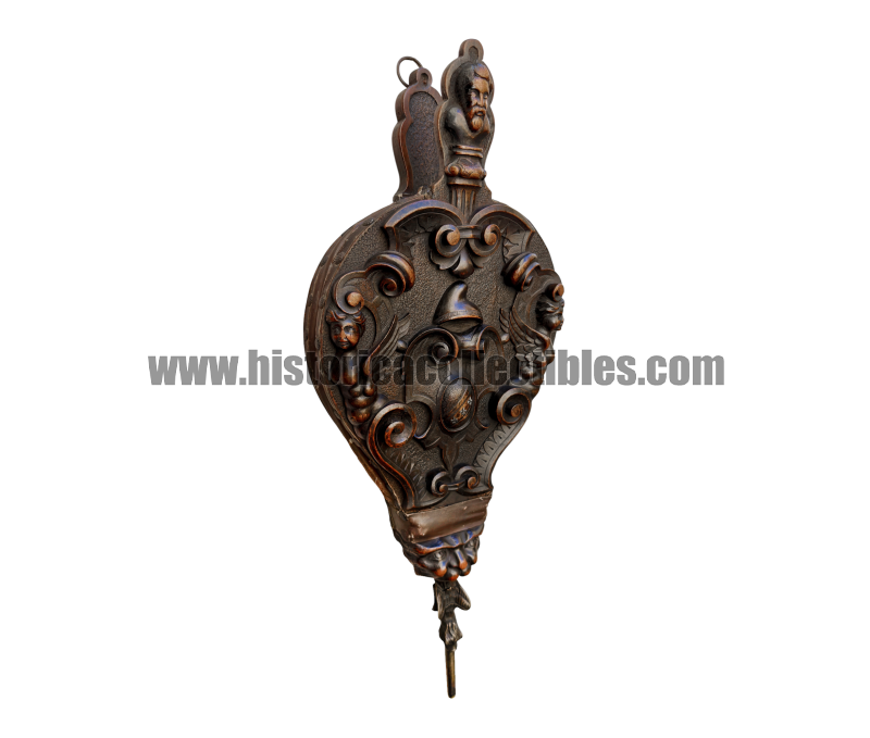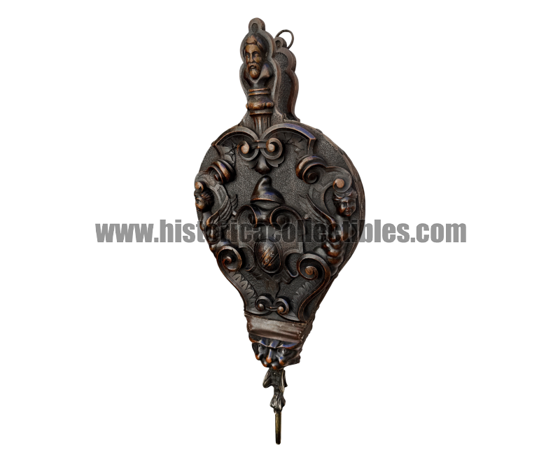 Two caryatids are symbolically placed for "protection" and decoration on either side of the coat of arms; the image of a half-length figure standing on a column, sculpted on the handle, provides a firm grip. A masterfully carved lion's head supports a carved and chiseled bronze "Chimera," from whose mouth protrudes a nozzle that directs the air generated by the bellows. The back is dominated by an extraordinary bas-relief image depicting a lion's mask, reminiscent of the "Bocche di Leone" (Lion's Mouths), or Boche de Leon in dialect. These were located throughout the city of Venice, particularly near and inside the Doge's Palace, and were used to collect secret reports from the people for the magistrates.