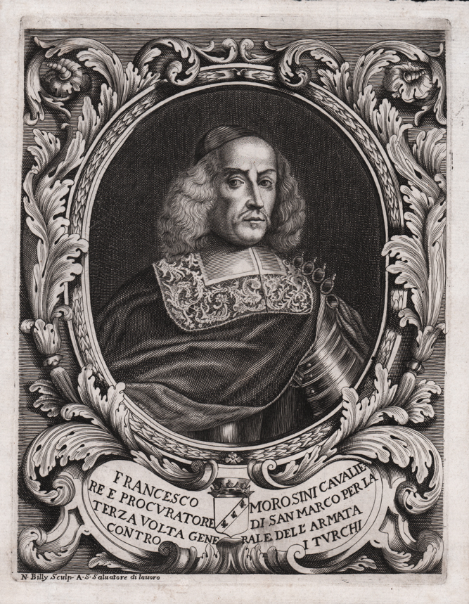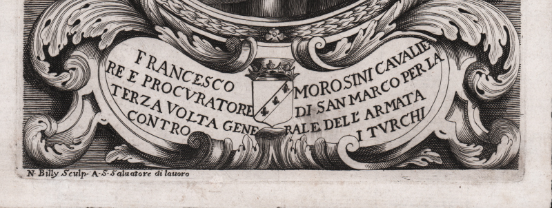 A walnut fireplace bellows, which belonged to Doge Francesco Morosini, a Venetian patrician, Capitano Generale da Mar (Supreme Commander of the Venetian Navy), Procurator of San Marco, and General of the Army against the Turks, datable between 1688 and 1694. The bellows, of typical 17th-century artistic design with scrolls and carved ornaments, features in the center one of the versions of his finely carved coat of arms banded with three silver lilies set in it, which is surmounted by the "Corno Ducale" or "Cappello del Doge", an office that Francesco Morosini held from 1688 to 1694.