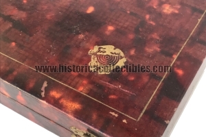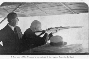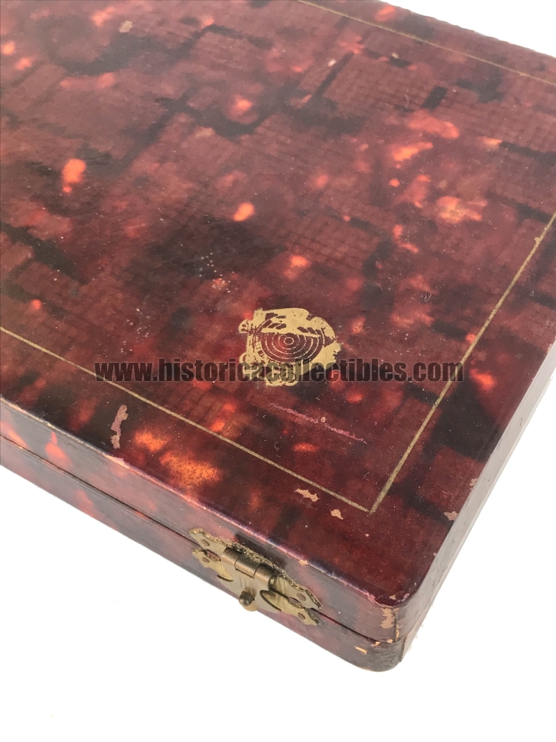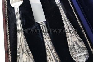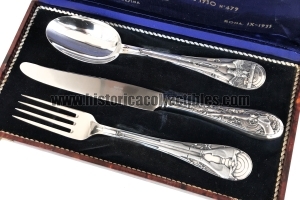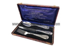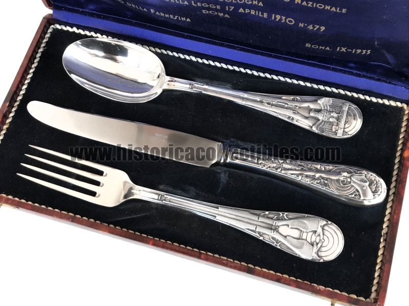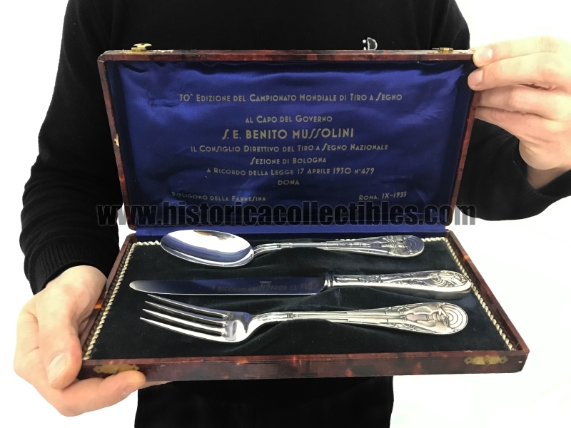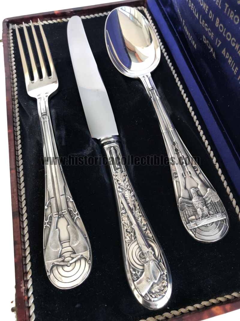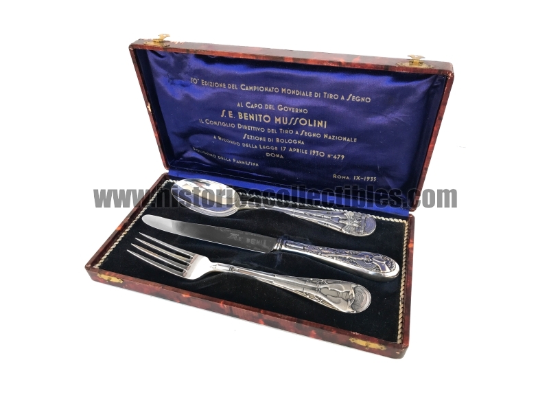 Grande cofanetto con all'interno tre posate (cucchiaio, forchetta e coltello) in argento massiccio, donato a S. E. Benito Mussolini, Capo del Governo, dalla Sezione di Bologna del Tiro a Segno Nazionale, in occasione della 30^ Edizione del Campionato Mondiale di Tiro a Segno svoltasi a Roma presso il Poligono della Farnesina nel mese di settembre del 1935, a Ricordo della Legge 17 Aprile 1930 n.479, come riportato per esteso nel cofanetto. Questa legge, insieme al successivo Regio Decreto 21 novembre 1932 n. 2051, riformarono il sistema del tiro a segno nazionale in modo significativo, sopprimendo il sistema elettivo delle cariche e introducendo la nomina dei dirigenti sociali da parte del Ministero della guerra.