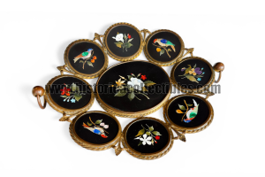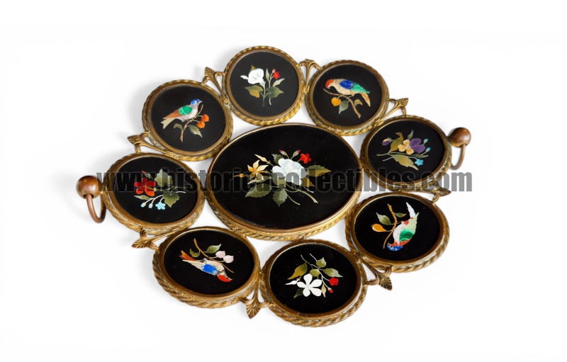 La placca centrale, di dimensioni maggiori e leggermente ovaleggiante, è decorata con un delicato intarsio di pietre dure a formare un mazzetto di fiori, quali Peonia, Bignonia e Anagallide. Otto più piccole e rotonde placche, sono disposte tutte attorno al tema preponderante per dimensioni, ornando questo centrotavola con raffigurazioni di vivaci uccellini e composizioni floreali.