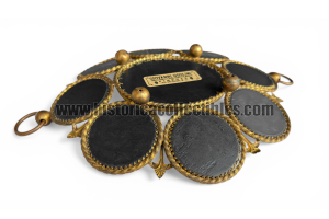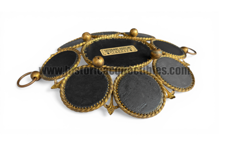 Centro-tavola, composto da una struttura in bronzo dorato, e da nove placchette magistralmente realizzate in commesso fiorentino da Giovanni Ugolini, uno dei più importanti e rinomati maestri mosaicisti attivi nella seconda metà del 1800 a Firenze.