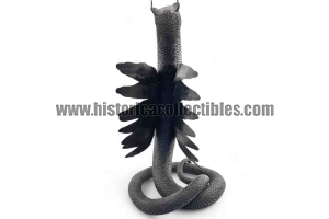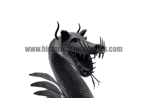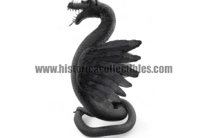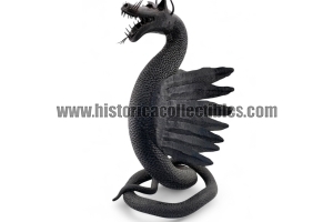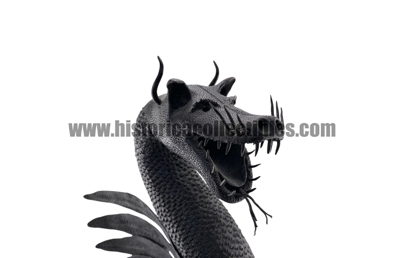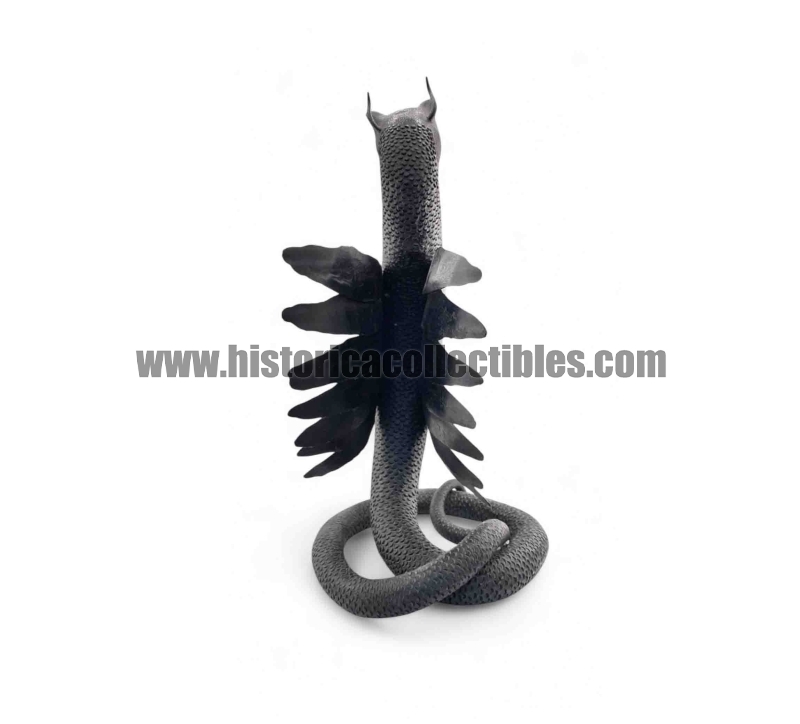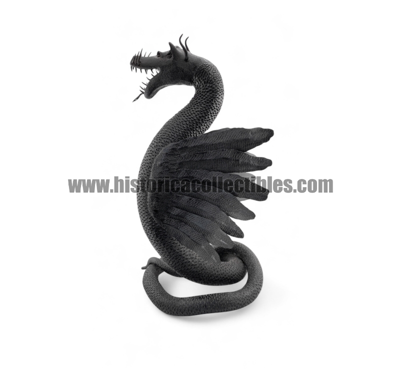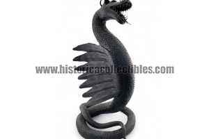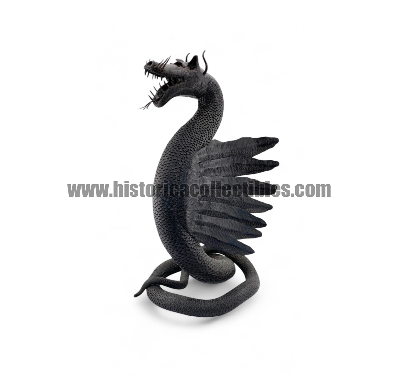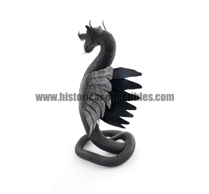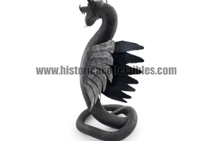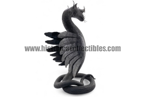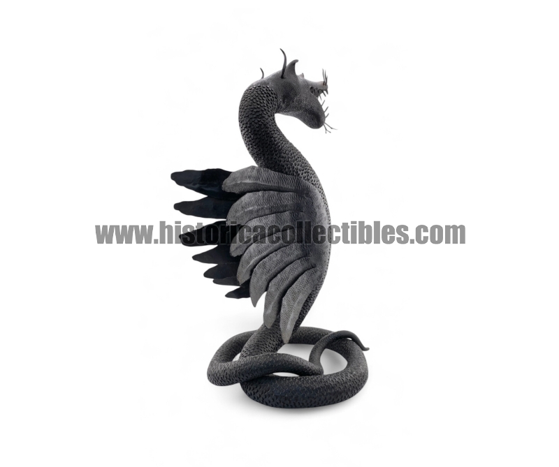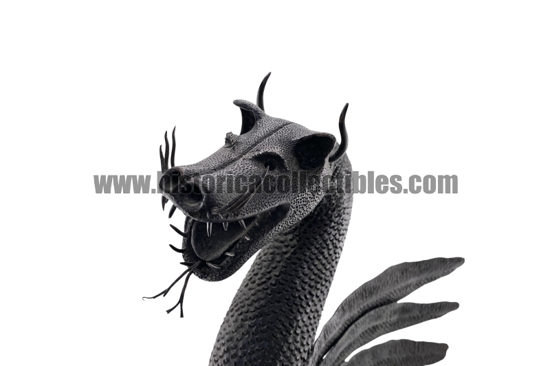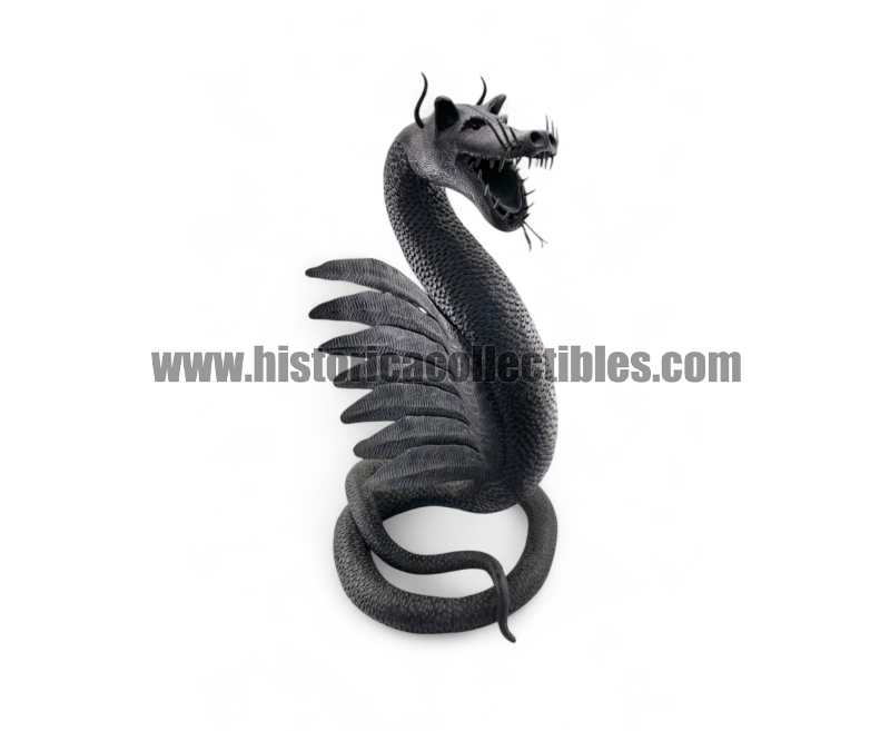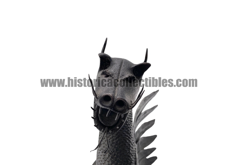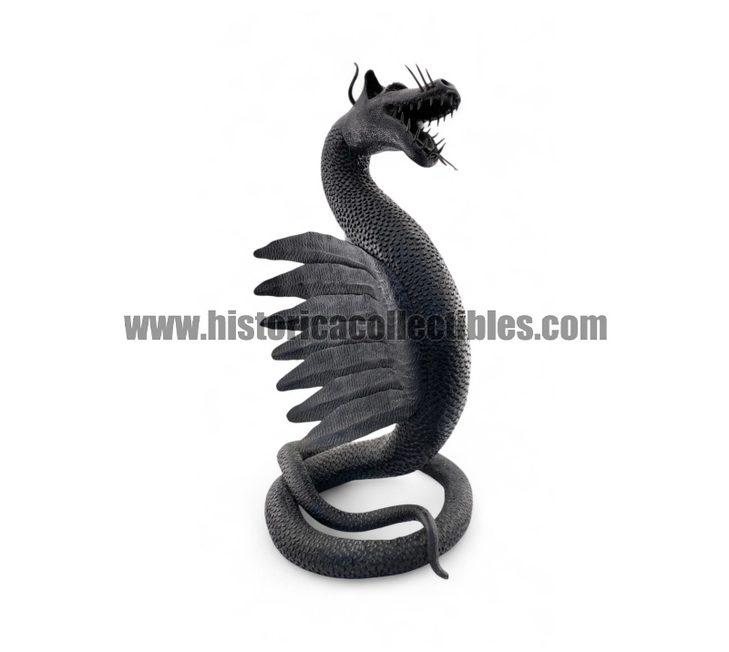 Questa scultura, modellata nella mitica figura di un Drago Alato, è stata realizzata utilizzando un unico blocco di ferro dal consistente peso di oltre 9 kg, tirato a mano alla forgia fino ad ottenere la lunghezza desiderata del corpo (disteso) di oltre un metro, con diametro variabile tra la testa ed il termine della sua coda; dopodichè su tutta la sua superficie, il Mastro Ferraio ha eseguito con accurato vigore una moltitudine di intagli a rilievo, da rendere così l'aspetto del corpo verosimilmente ricoperto di scaglie. Continuando ancora ad osservare la figura, si fanno notare le due grandi ali, formate ognuna da sette singole piume incise e piegate a voler imitare quell'effetto di leggerezza e vigoria quasi a favorirne il volo. Oltreciò non si può non rimanere affascinati ammirando la sagoma della sua testa, ben proporzionata e definita insieme a tutti i suoi particolari eseguiti con notevole perizia. Ma ciò che la rende unica è l'espressività inquietante della sua grande bocca, colma di denti aguzzi e spalancata come stesse per scagliare incandescenti palle di fuoco.