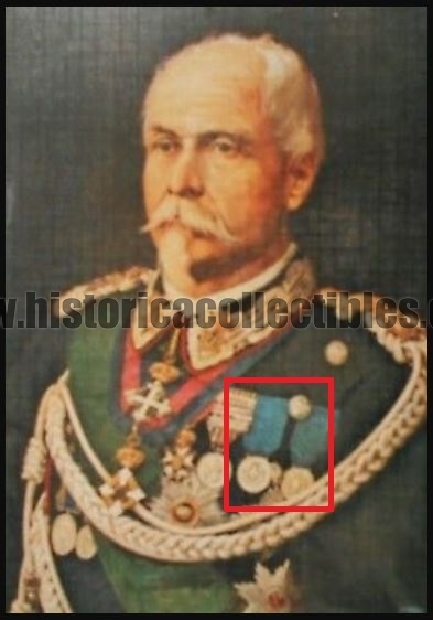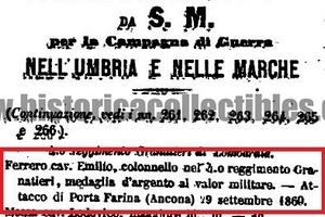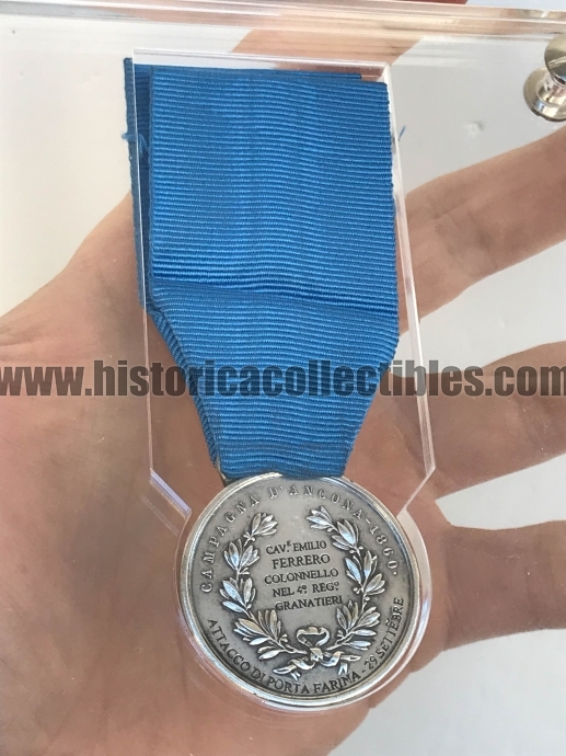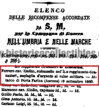 Questa medaglia fu conferita, come ci indica l'incisione riportata al verso, al "Cav. Emilio FERRERO, Colonnello nel 4° REG°. GRANATIERI", per aver preso parte all'Attacco di Porta Farina avvenuto il 29 settembre 1860". A convalidare quanto sopra scritto, risulta essere pubblicato sulla "Gazzetta Ufficiale" Nr. 267 del 9 Novembre 1860, dove viene menzionato il conferimento della medaglia nell'elenco delle ricompense accordate per la Campagna di Guerra nell'Umbria e nelle Marche.