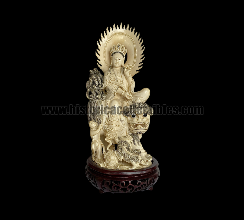 Grande scultura realizzata in un unico blocco di avorio raffigurante una Guanyin (觀音), divinità buddista della compassione e della misericordia, seduta su "cane di Fò" con ai suoi piedi un "bambino" ed un altro piccolo "cane di Fò".