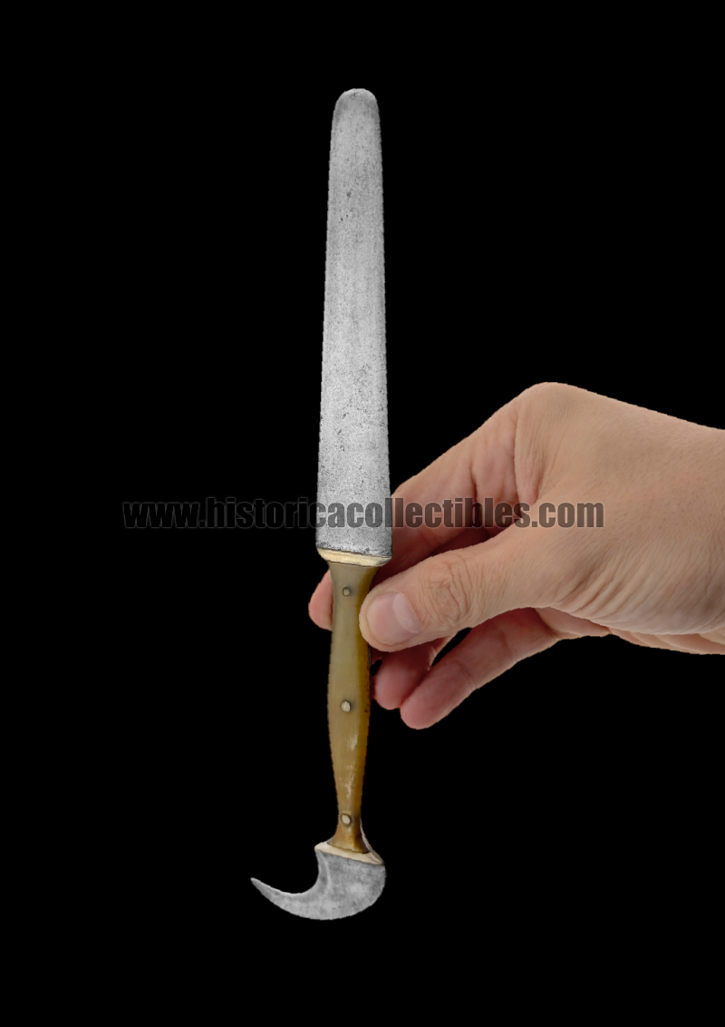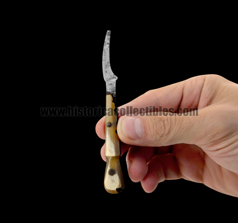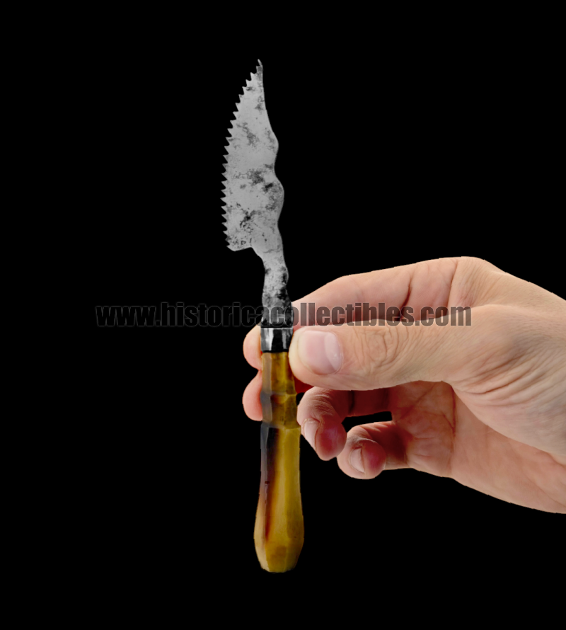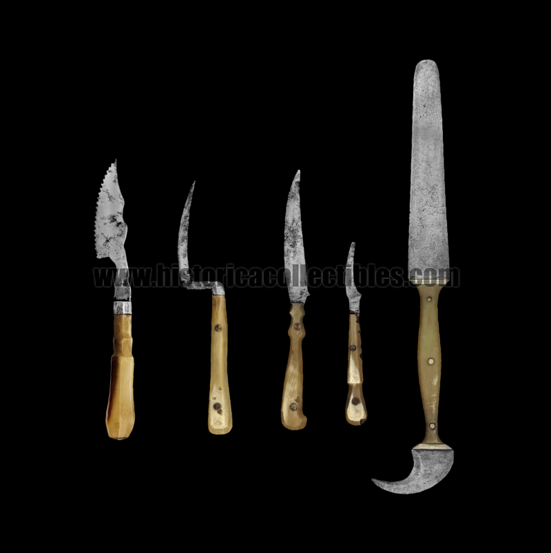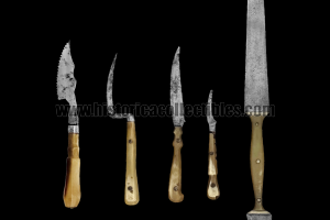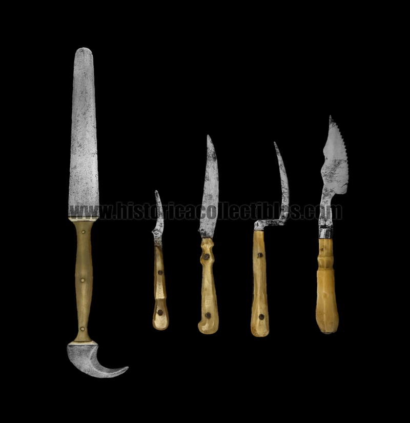 Set di 5 Strumenti Chirurgici, prodotti in Italia o Francia, tra il 1700 ed 1730 circa. Questi 5 strumenti, facenti parte tutti dello stesso set, sono dotati di manico in corno il quale, non solo consente una presa più salda rispetto a strumenti realizzati nel 500 e 600 completamente in ferro forgiato, ma conferiscono un certo pregio a questi strumenti. Infatti, come noto, i medici più importanti dell'epoca, erano soliti acquistare o farsi produrre strumenti, si che avessere ovviamente un fine pratico, ma che esprimessero il gusto personale e lo "status medici" in modo immediato ed efficace.